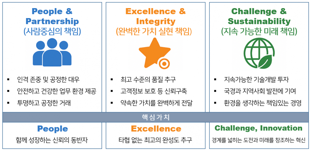 - 공정하고 윤리적인 자세 : 모든 임직원은 타협없는 최고의 완성도를 추구하는 전문가로서, 높은 윤리적 가치관을 가지고 품위와 명예를 유지하며, 개인의 사적 이해관계를 배제하고 공정하게 직무를 수행한다.